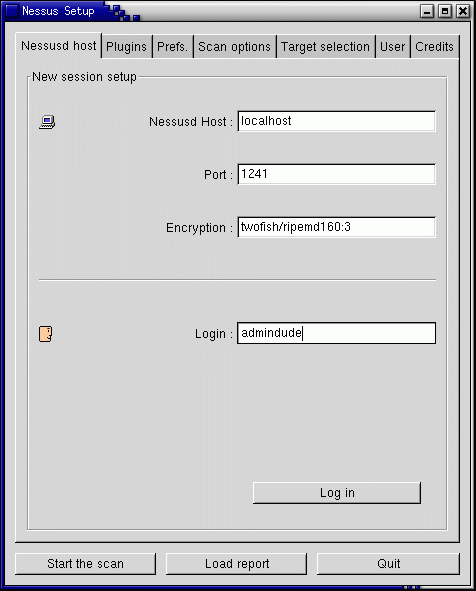 Login : admindude Authentication method (cipher/plaintext) [cipher] : Is "admindude" a local user on this machine [ |n]? y New pass phrase: ... - Start server daemon: /usr/sbin/nessusd